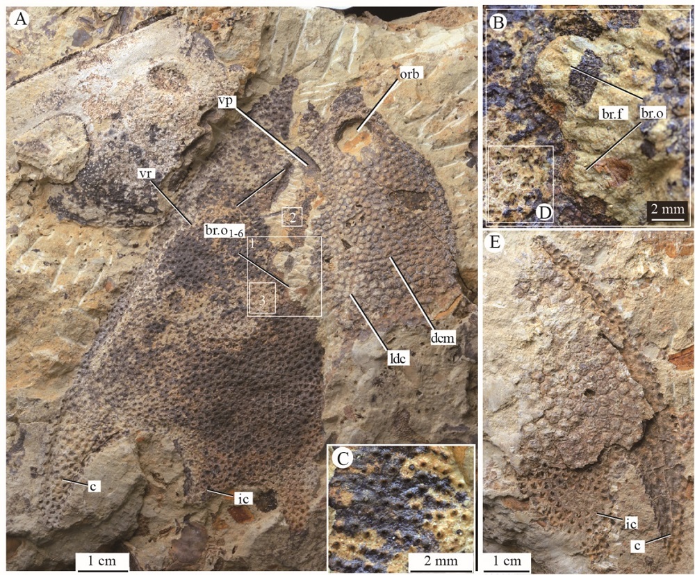 | Fig. 4 Photographs of Nochelaspis maeandrine , IVPP V 26124.1, 4 from the light-yellow pelitic siltstone of the Xishancun Formation in Qujing, Yunnan, China A. an incomplete headshield (left-half part) of N. maeandrine , V 26124.1 associated with an incomplete headshield of Laxaspis cf. L. qujingensis , in dorsal view; B. close-up of two branchial openings (box inset 1 of |