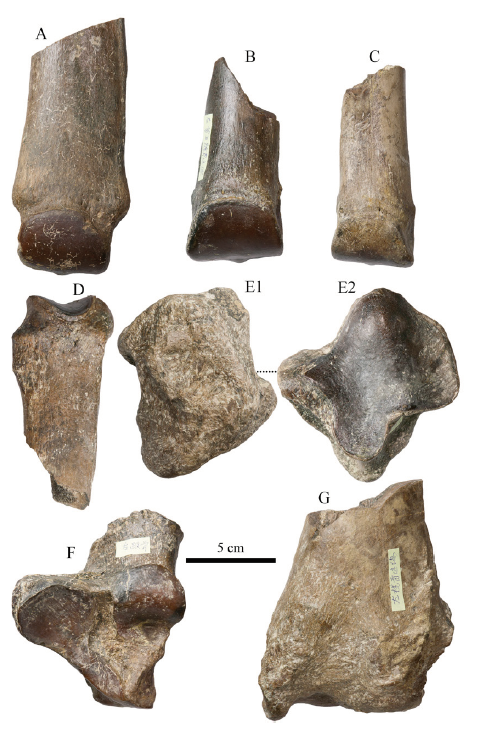 Fig. 6 Limb bones of Hipparion (Plesiohipparion) houfenense from Yegou A. proximal portion of left Mc III (IVPP V 18837.10: 1. proximal view, 2. anterior view); B. proximal portion of right Mt III (V 18837.15: 1. proximal view, 2. anterior view); C. proximal portion of right Mt II (V 18837.16: anterior view); D. distal portion of right humerus (V 18837.8: posterior view); E. right talus (V 18837.13: anterior view); F. ungual phalanx of the central digit (V 18837.17: anterior view); G. right calcaneus (V 18837.14: 1. lateral view, 2. medial view)