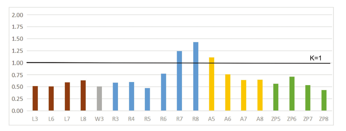 Fig. 3 Significant phylogenetic signal detected in cervical vertebral traits using Blomberg’s K Traits with K-value over or equal one indicates strong phylogenetic signal as following browning motion and are phylogenetically conserved. Traits with a K-value smaller than one indicate a departure from Brownian motion. Different categories of measurements are labeled with different colors Abbreviations: A. zygapophyseal angle; L. centrum length; R. ratio of centrum length to width;W. centrum width; ZP. zygapophoseal protrusion