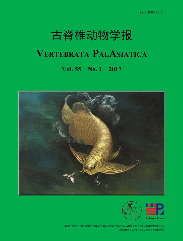 封面说明:中华金龙鱼(Scleropages sinensis sp. nov.)复原图。产于湖北松滋和湖南湘乡早始新世地层中的中华金龙鱼是金龙鱼化石的首次发现。金龙鱼属于骨舌鱼科,现生的金龙鱼(Scleropages)见于东南亚和澳大利亚的淡水水域中。淡水鱼类的跨洋分布,是动物地理学的难题之一。中华金龙鱼的发现,说明金龙鱼和骨舌鱼科其他属在早始新世就已经分化,这对解释骨舌鱼科的跨洋分布具有重要意义。现生的金龙鱼生活于各种河流和小溪中,比较喜欢水草茂盛的静水环境,以鱼虾、昆虫为食,它们往往会跃出水面进行捕食。新种中华金龙鱼也应该有相似的生长环境和食性。详见本期张江永、WILSON文(p. 1)。(绘图:许勇)
